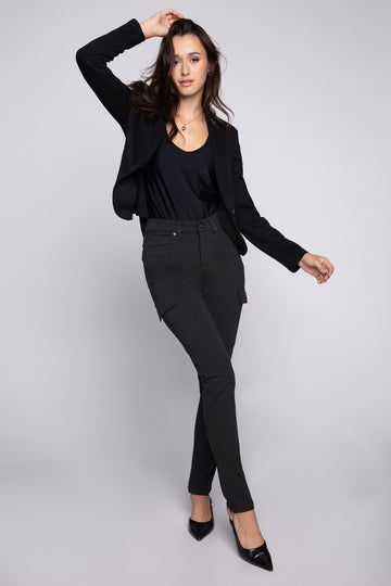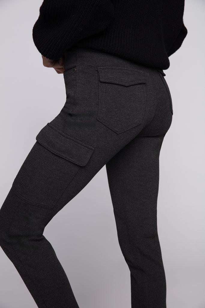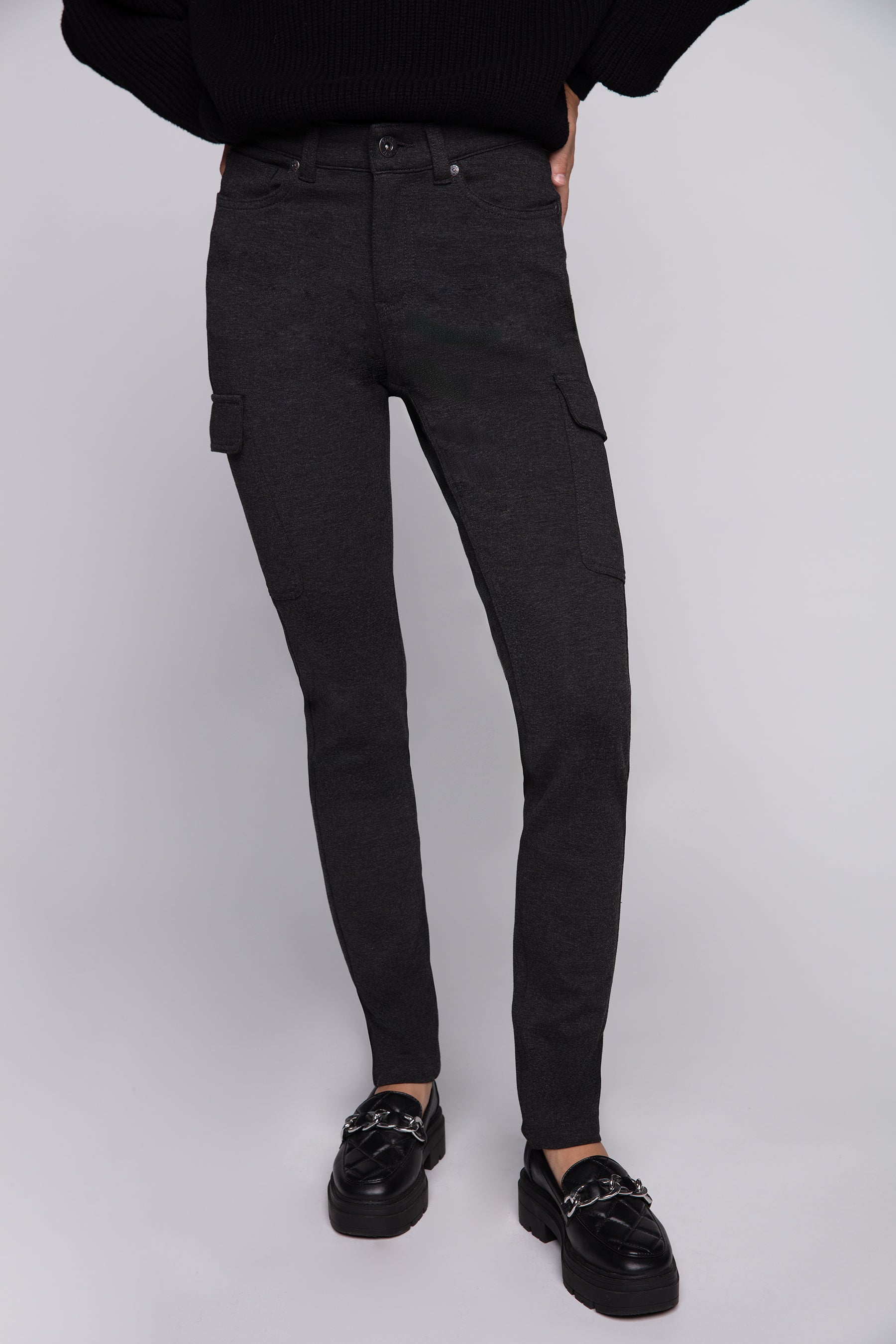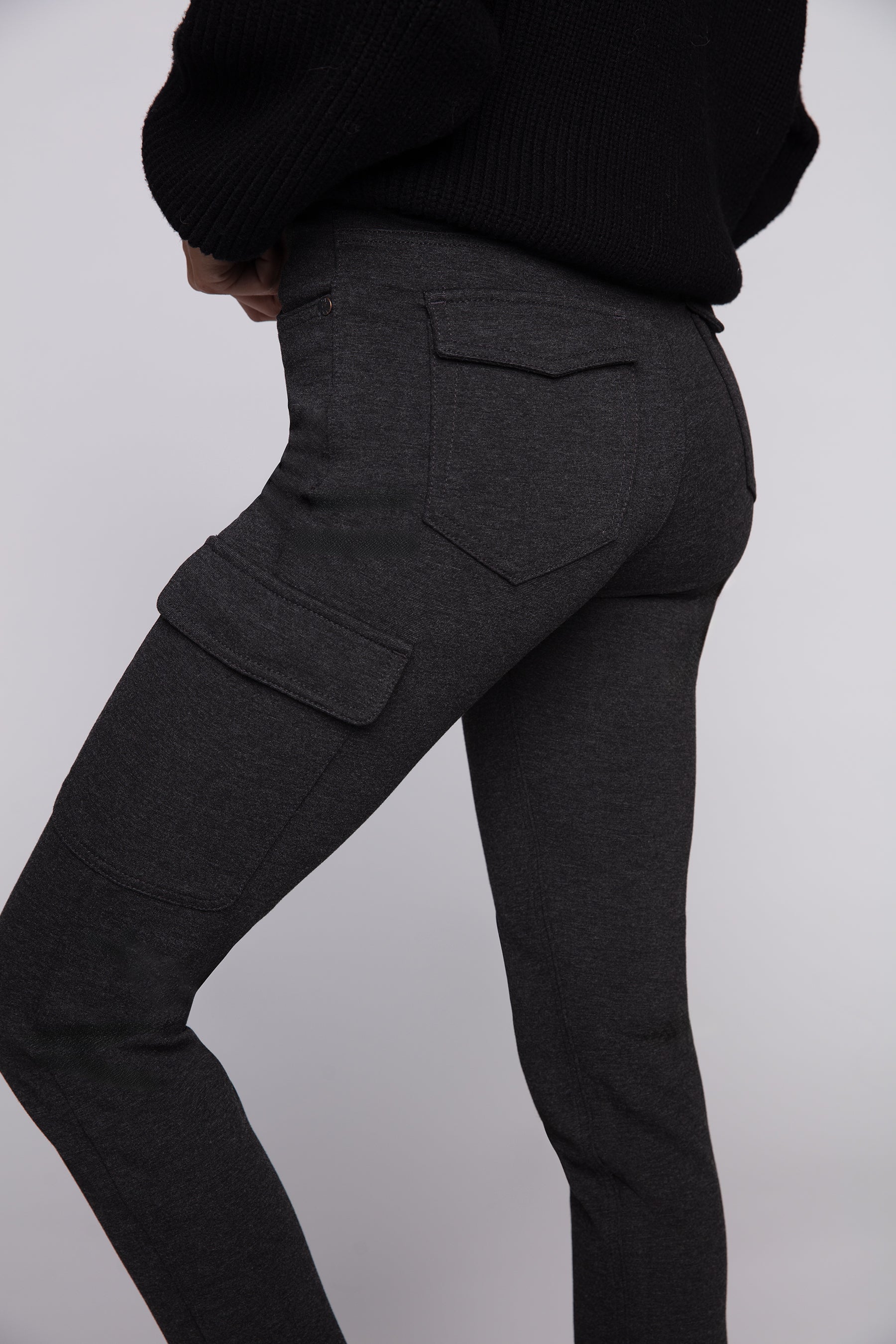 Upgrade your laid-back looks with the TARA knit cargo jogger in charcoal. Designed for all-day ease, this style features 4-way stretch ponte fabric, cargo pockets, zip fly, and back flap pockets. The regular-rise waistband and elastic cuffs keep the silhouette sleek and secure.