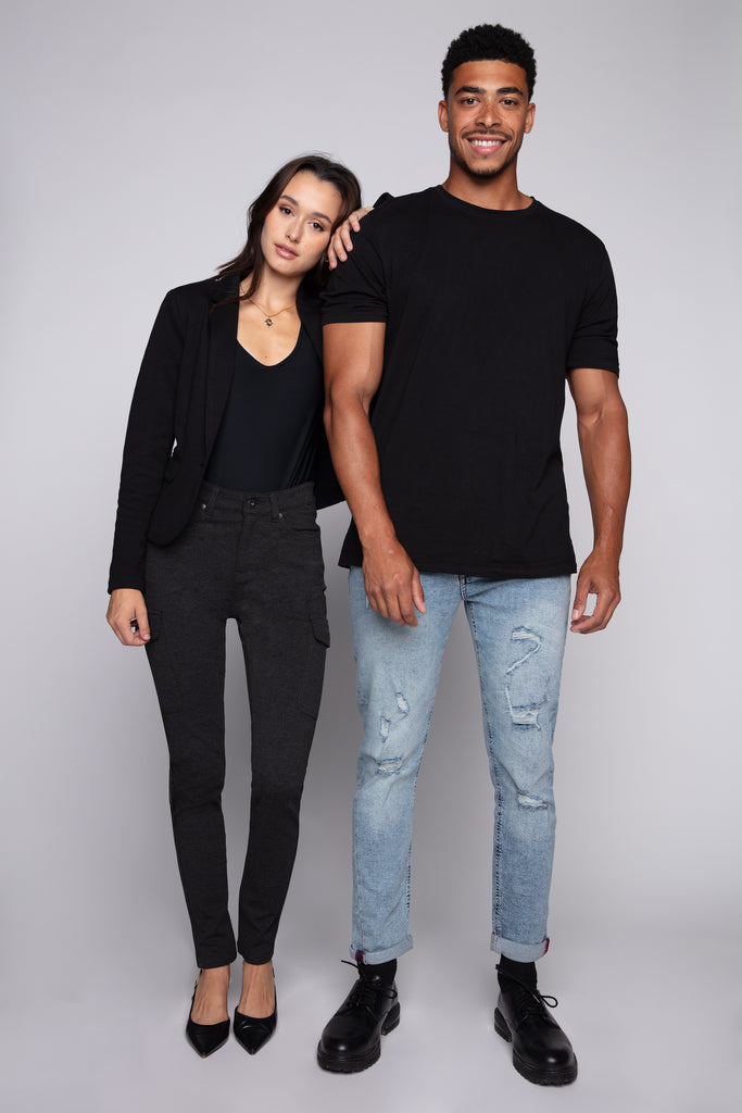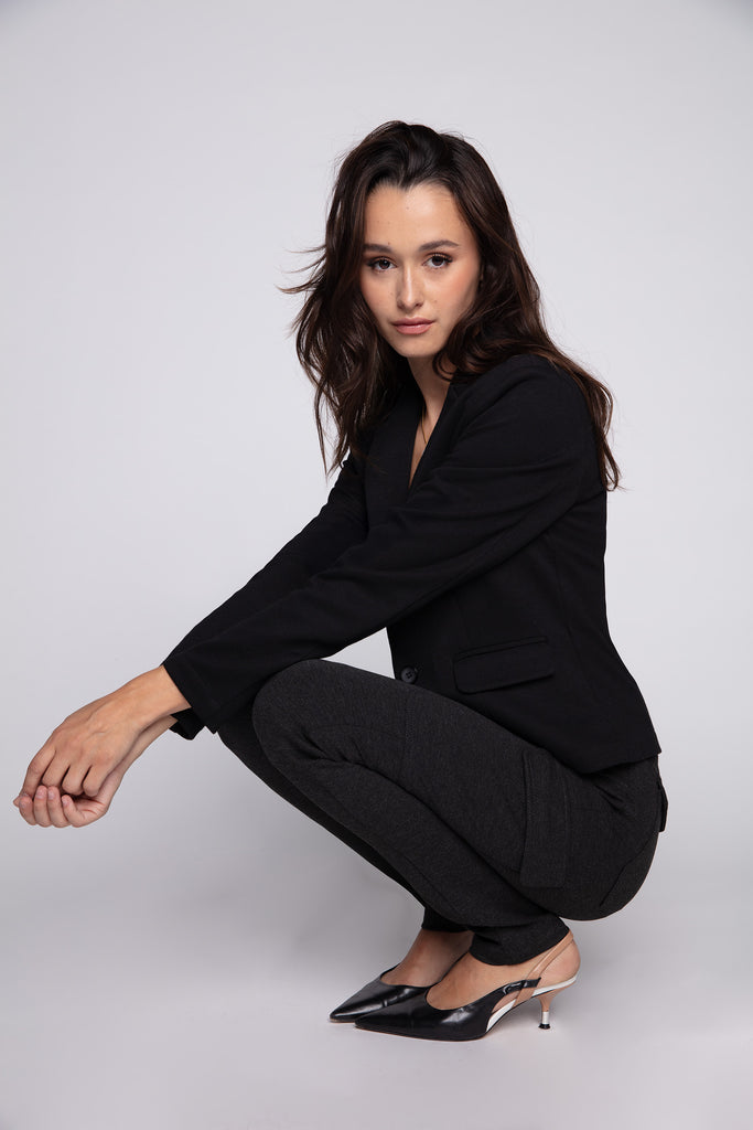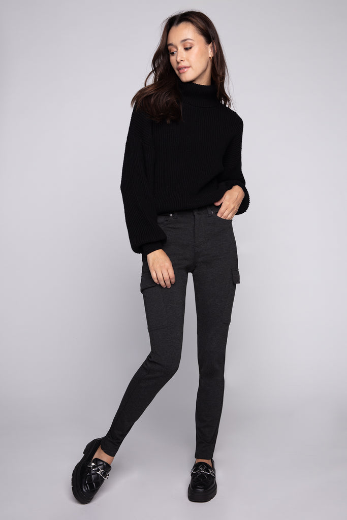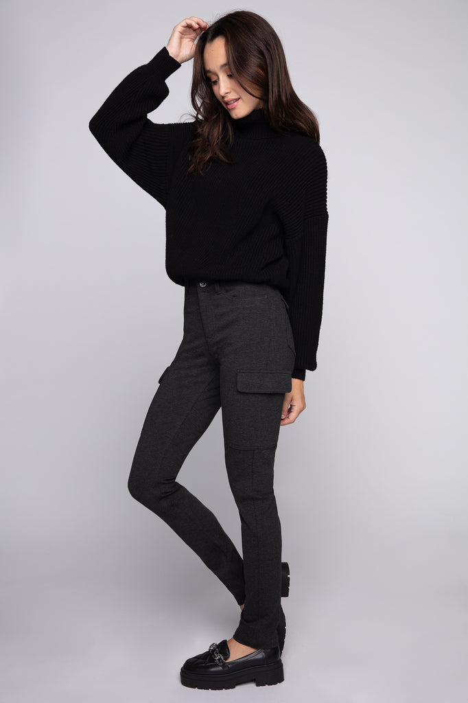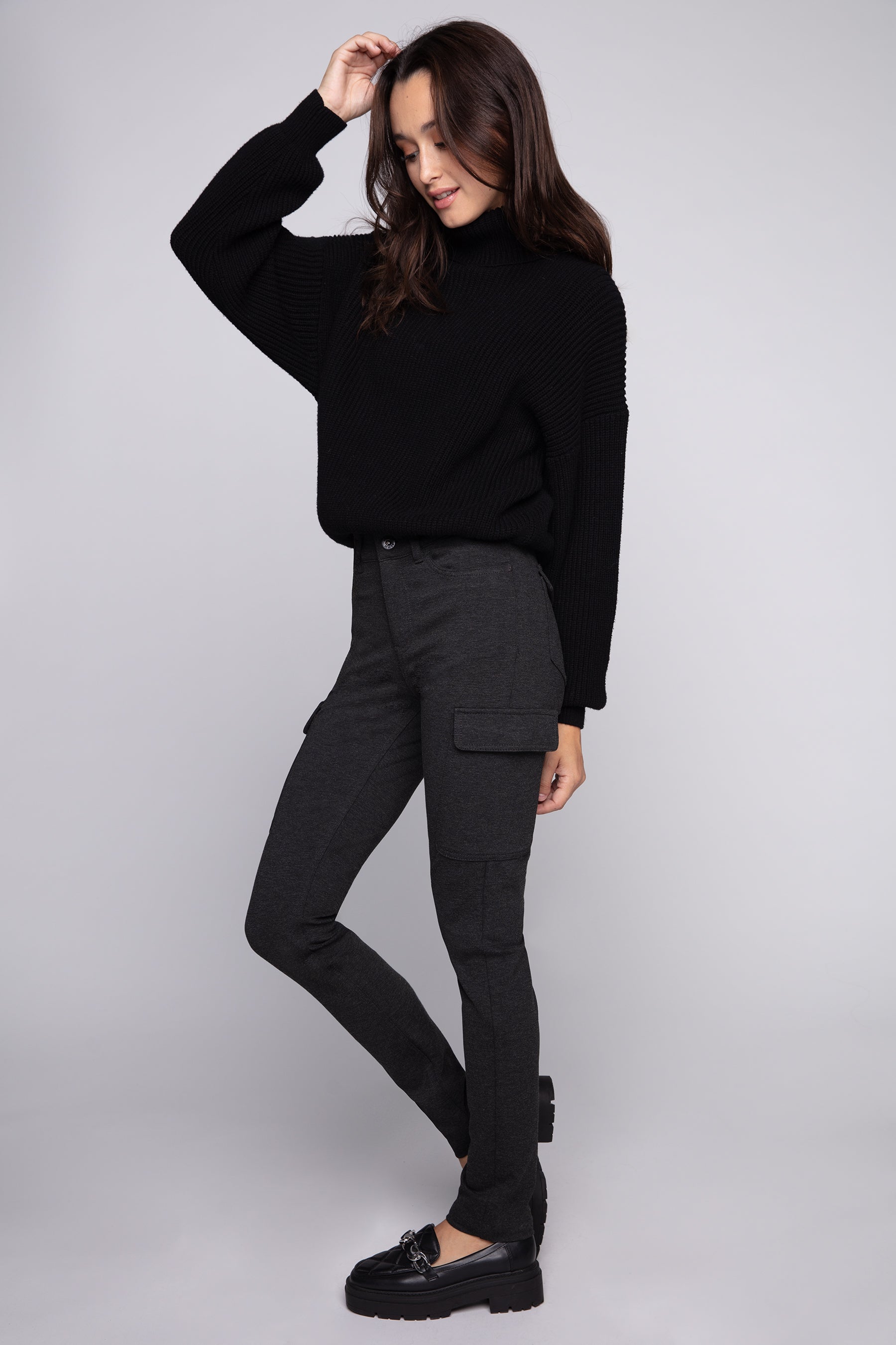 Upgrade your laid-back looks with the TARA knit cargo jogger in charcoal. Designed for all-day ease, this style features 4-way stretch ponte fabric, cargo pockets, zip fly, and back flap pockets. The regular-rise waistband and elastic cuffs keep the silhouette sleek and secure.
