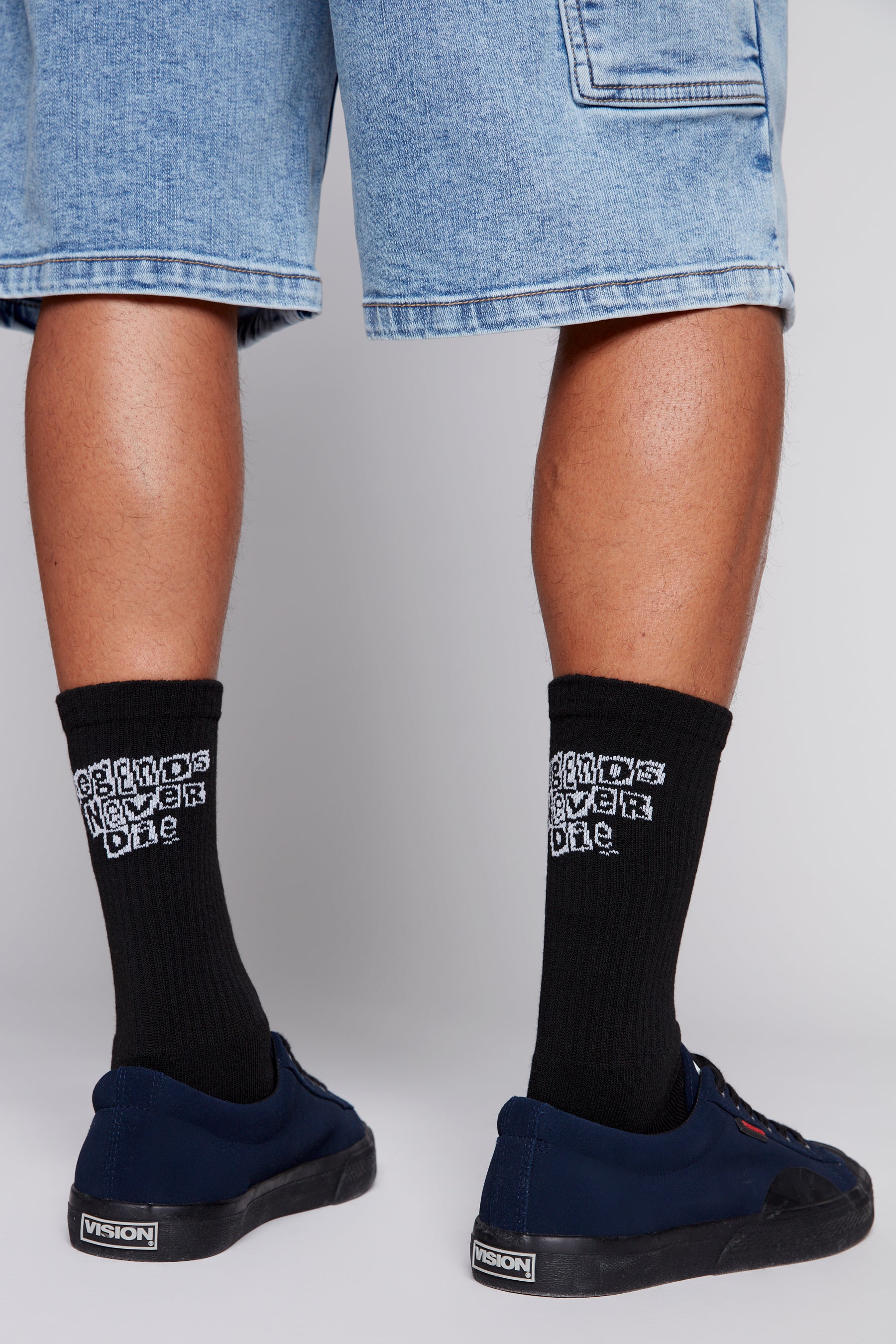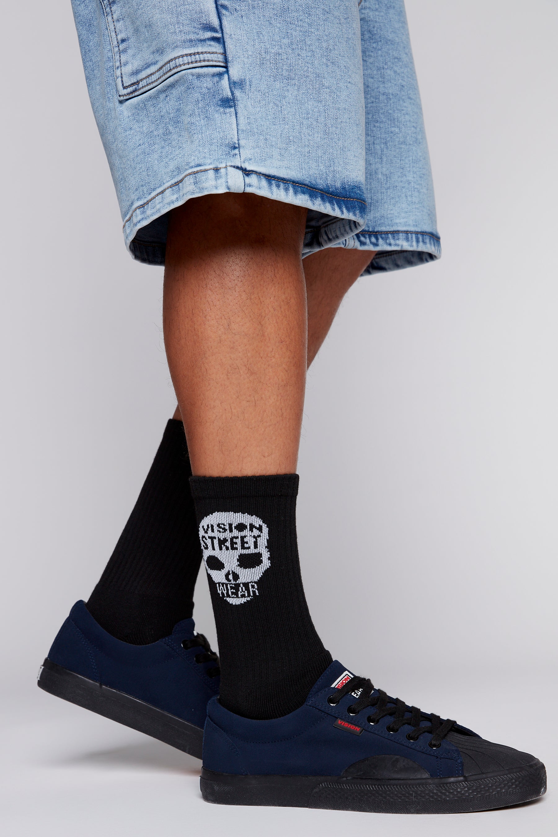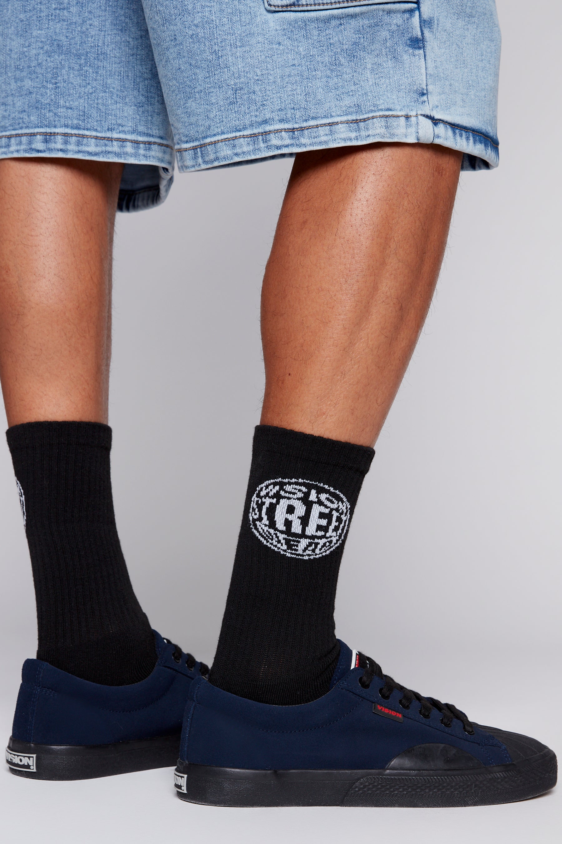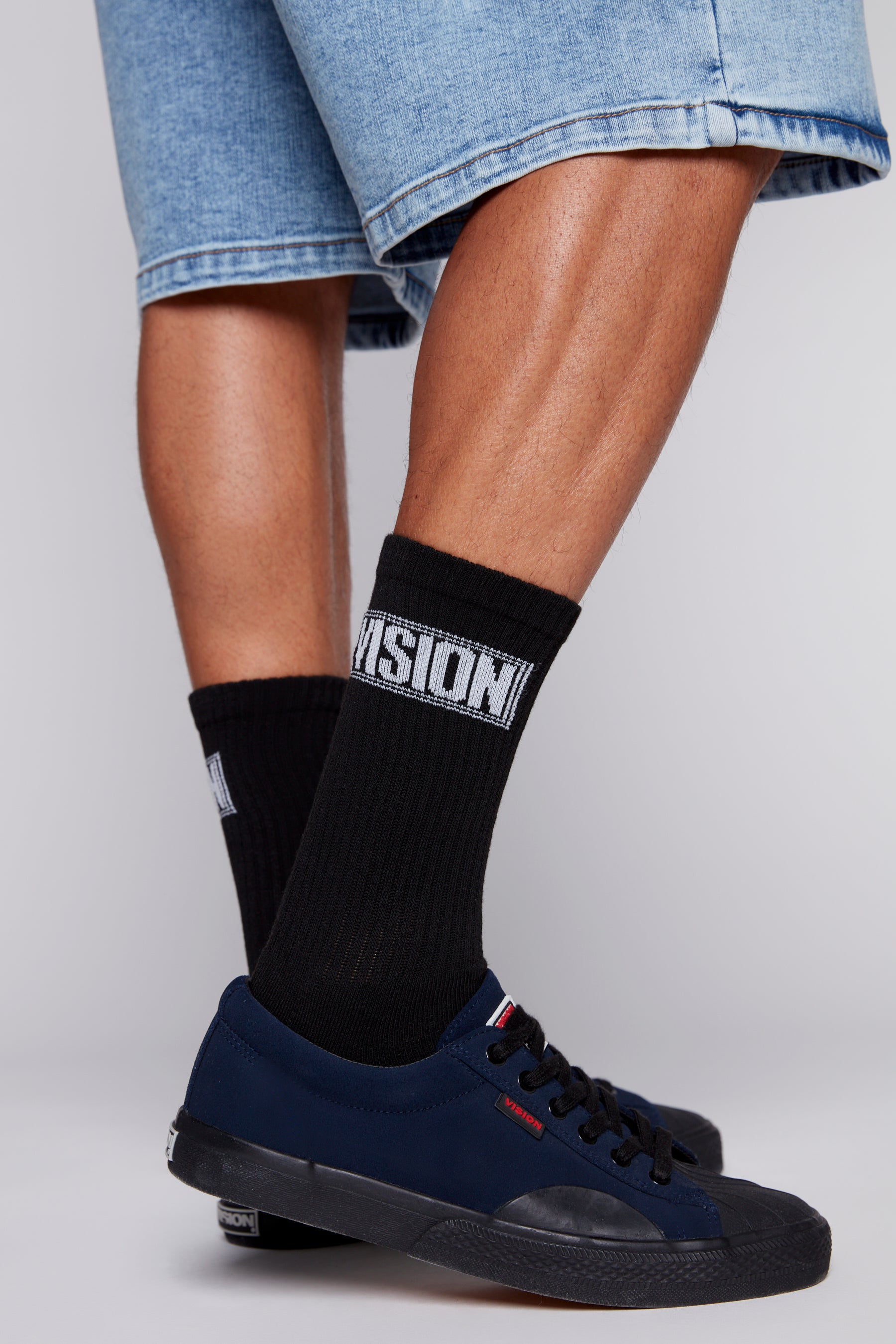 Step up your street style with the Vision Street Wear™ Logo Crew Socks in black. Designed for both comfort and impact, these ribbed socks feature bold woven Vision branding for a statement finish. The breathable cotton-blend fabric and supportive fit make them perfect for skating, training, or everyday wear. Pair them with shorts or cuffed pants to show off that iconic logo.