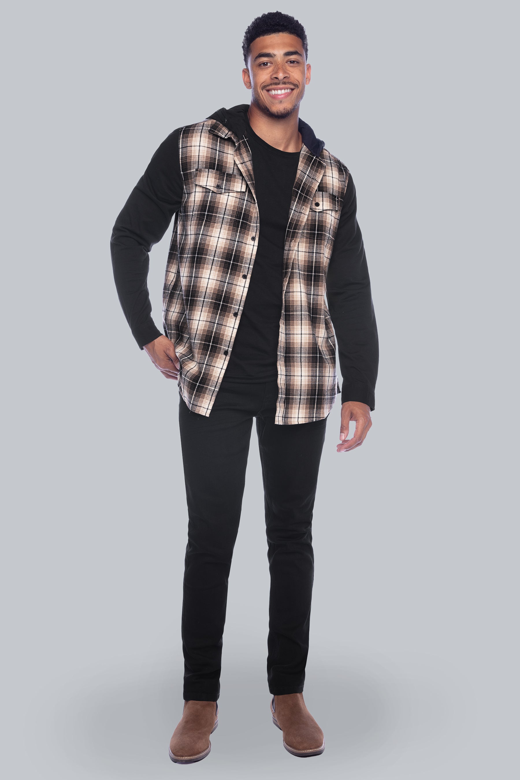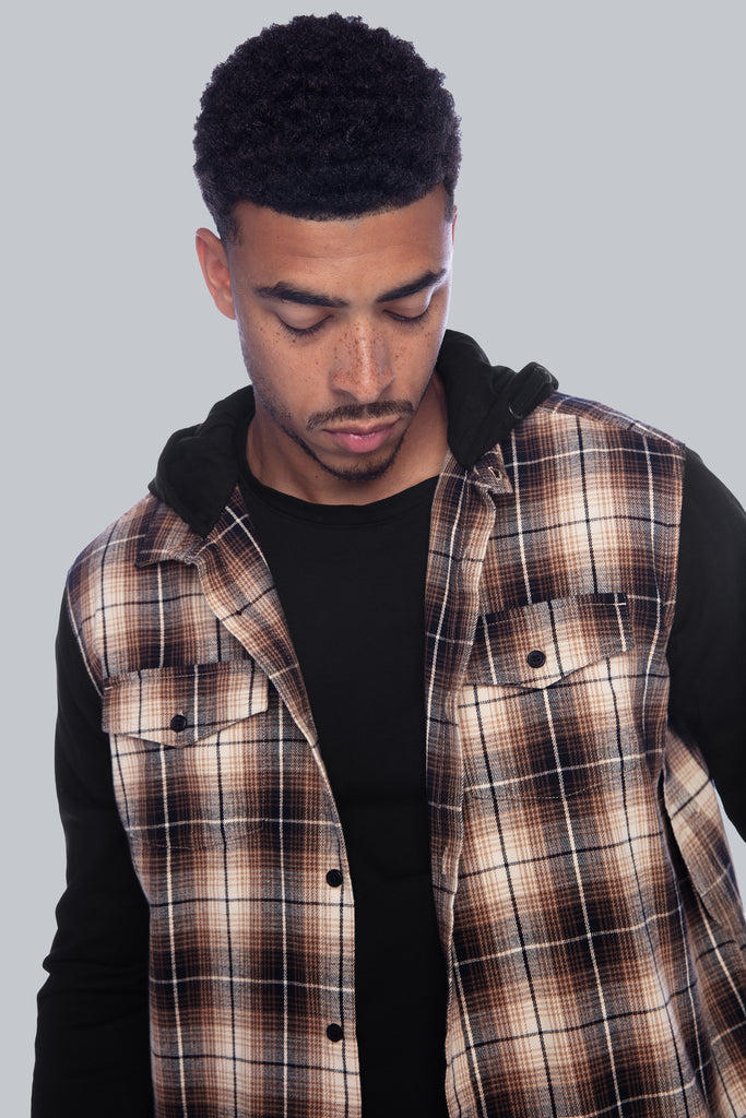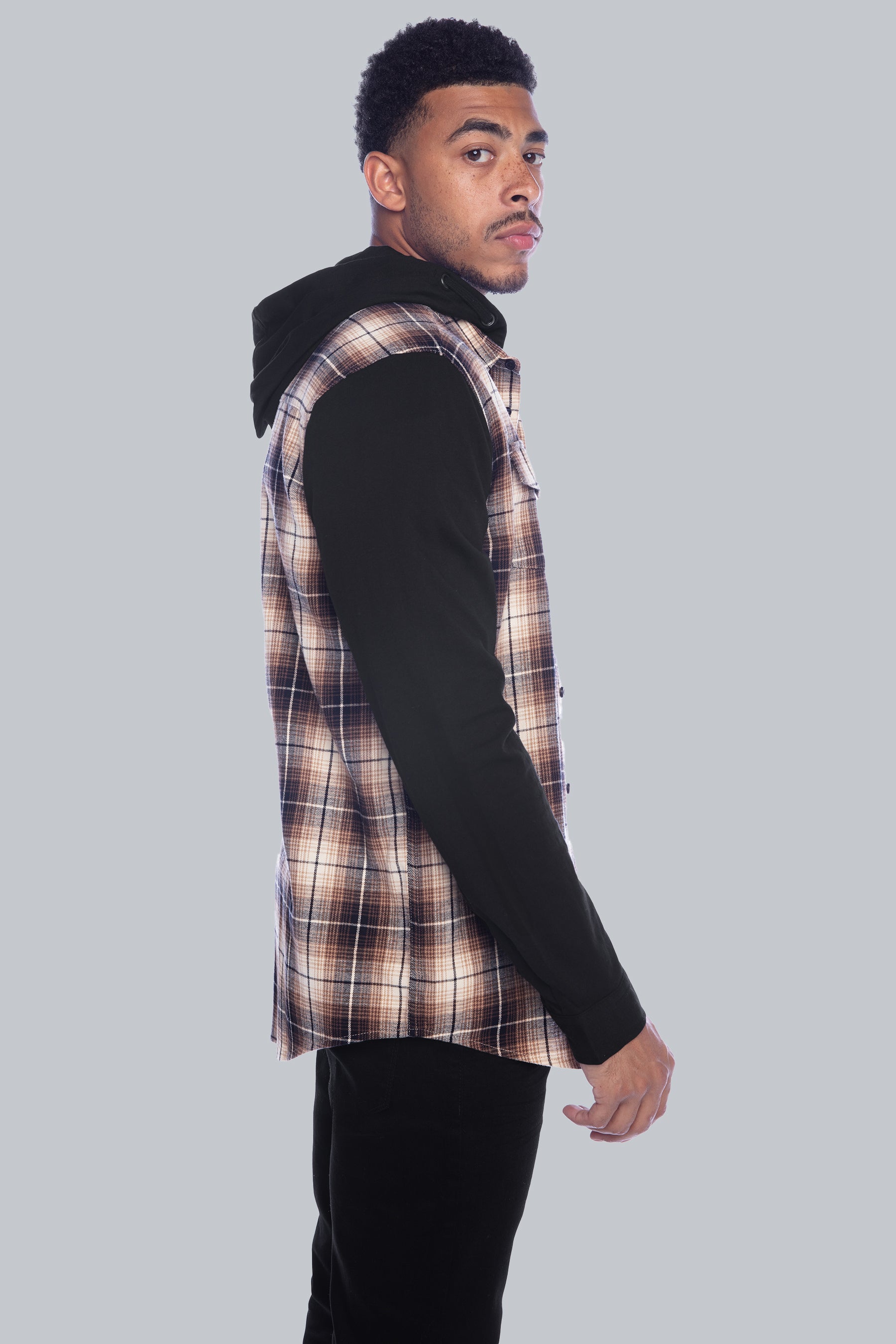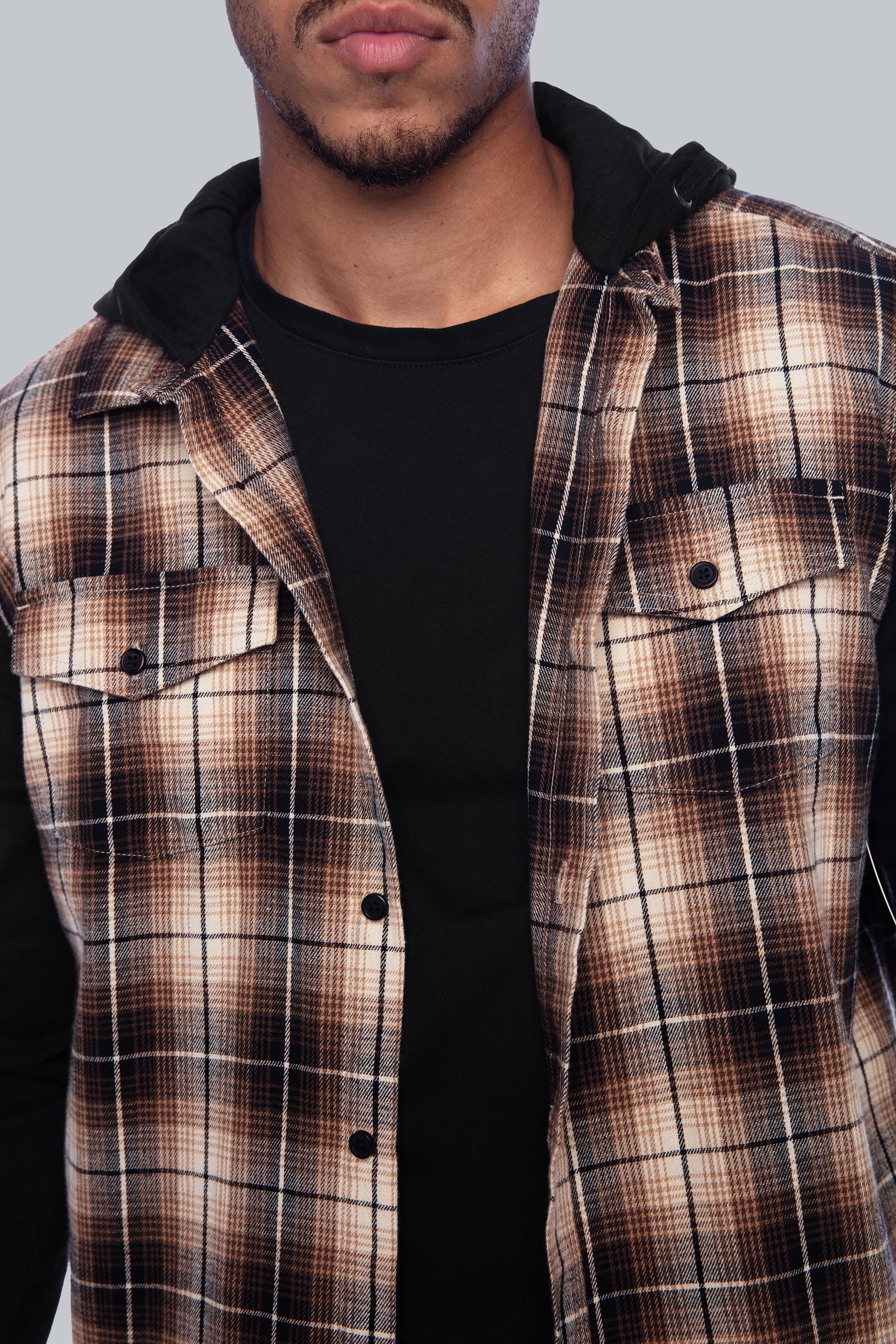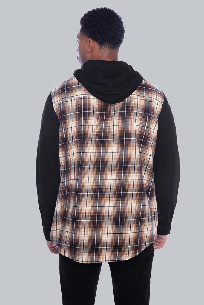 MEN’S BROWN PLAID HOODED FLANNEL SHIRT