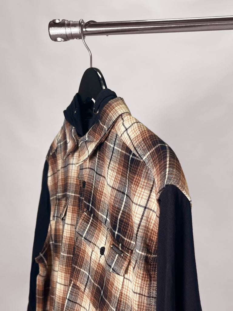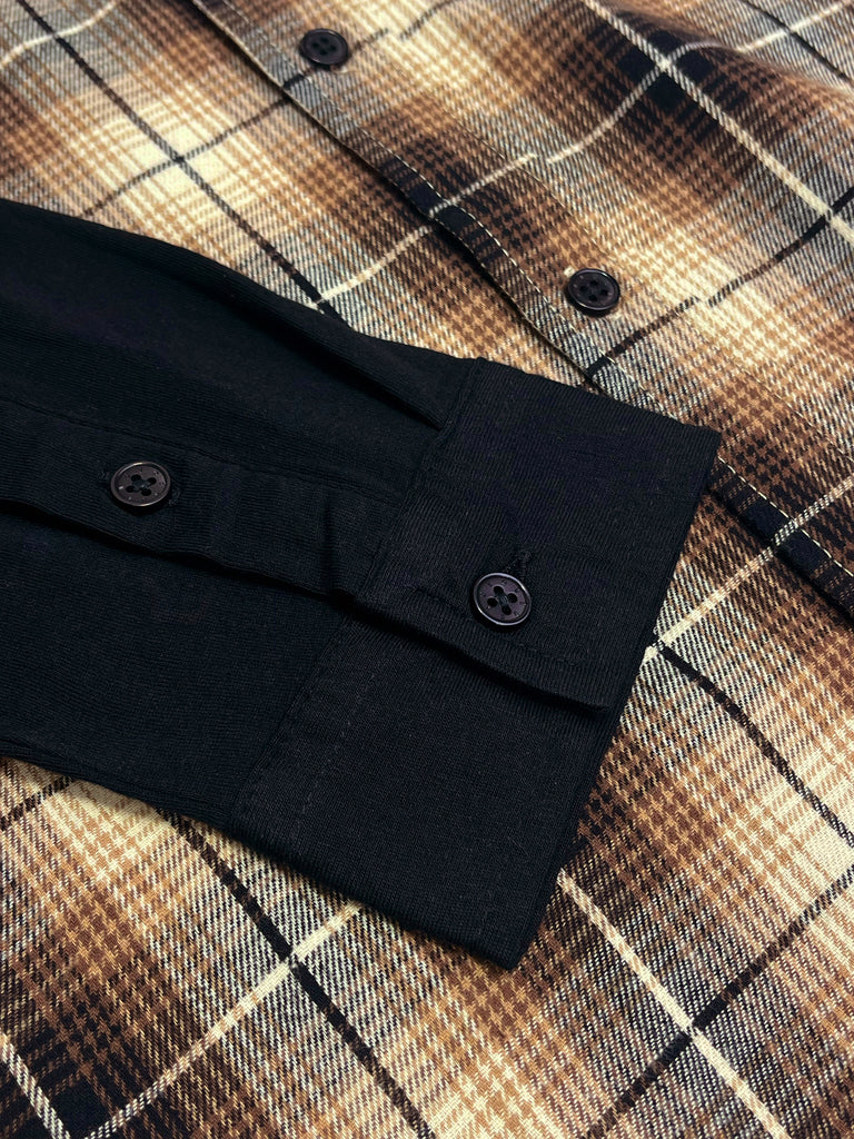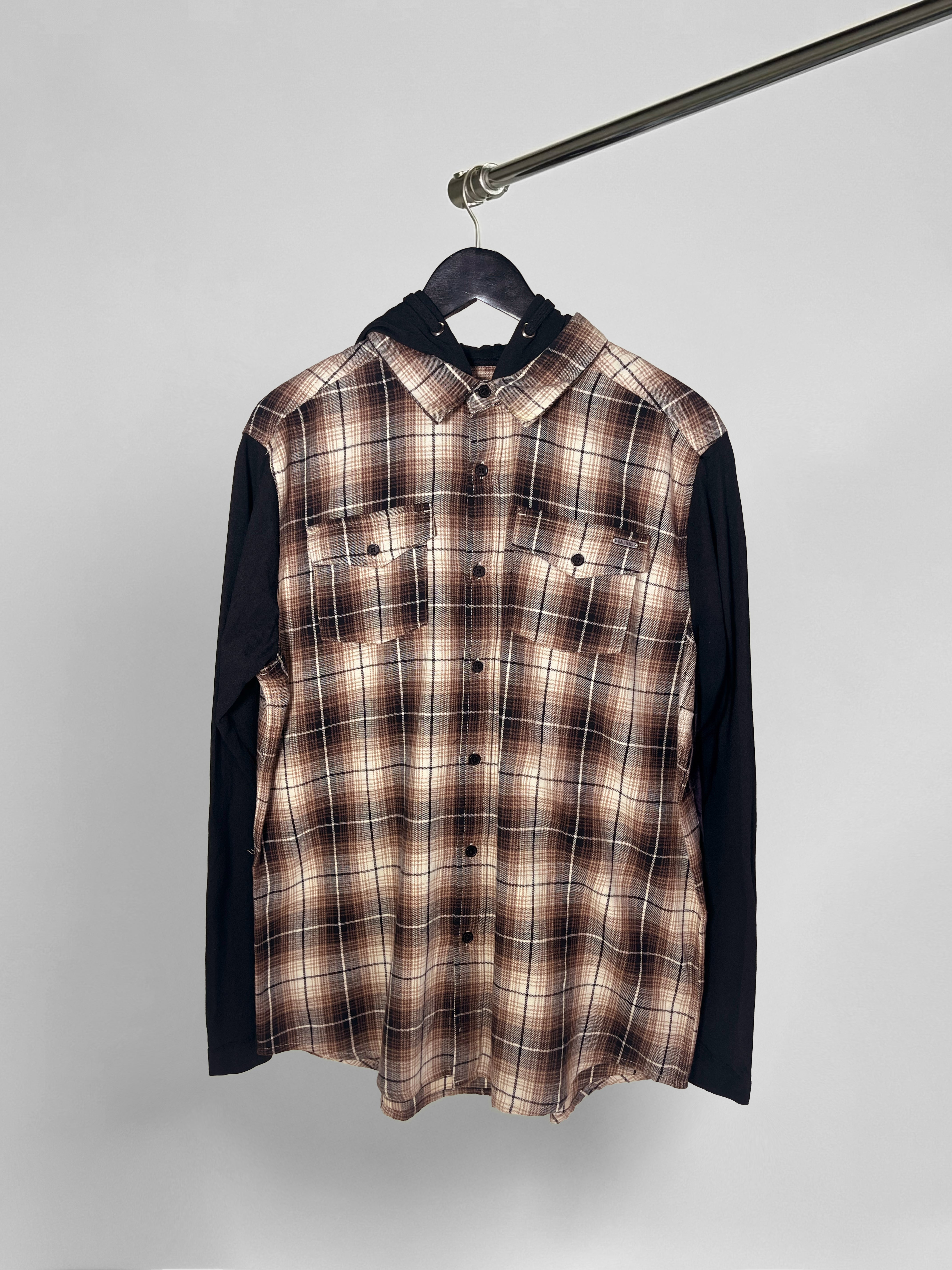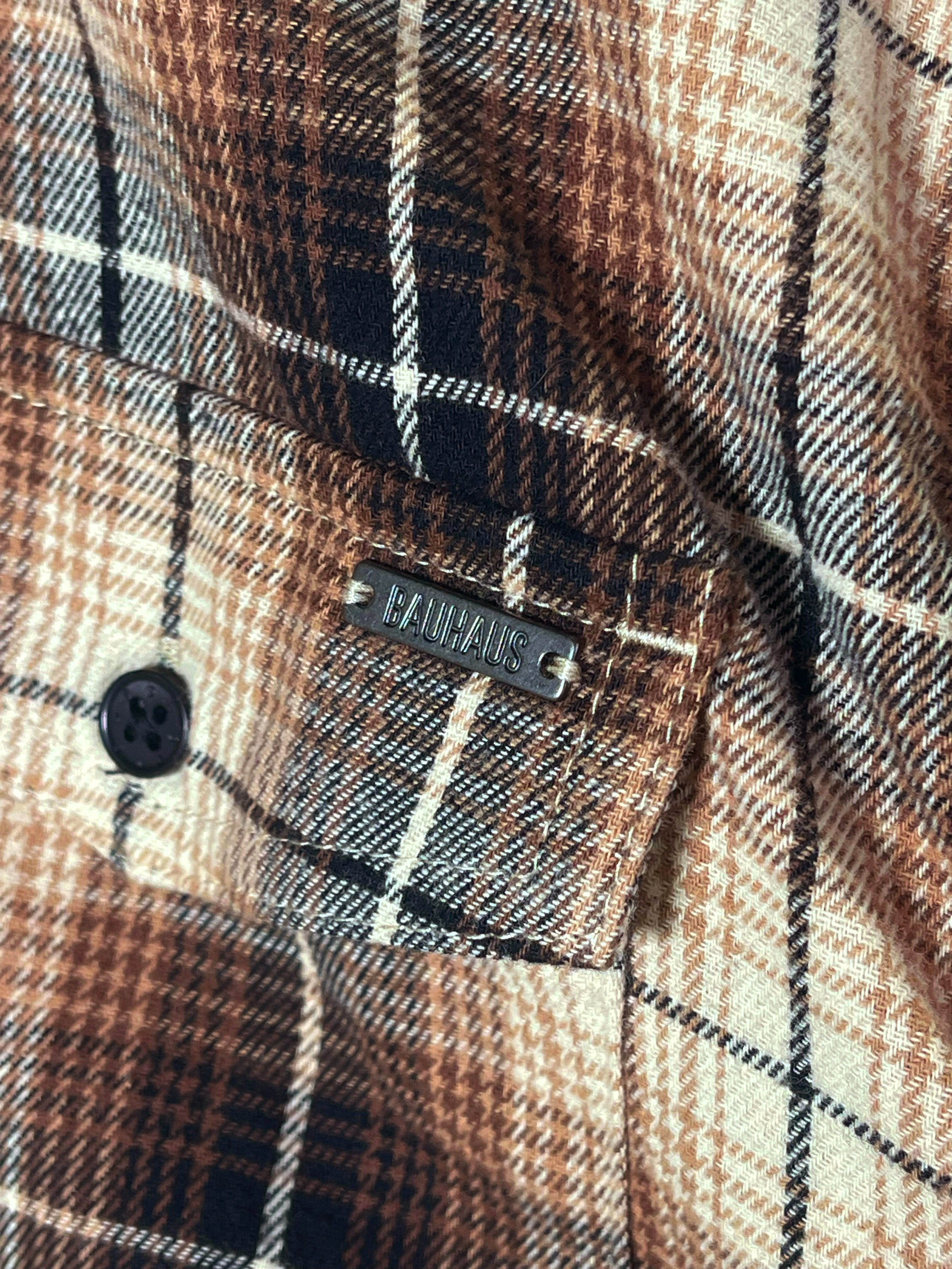 Blend rugged flannel style with modern comfort in the Bauhaus brown Plaid Hooded Terry Shirt. Designed for the cooler months, this long-sleeve button-front shirt combines a soft flannel plaid body with stretch jersey sleeves and hood for an easy, layered look. The buttery-soft handfeel and relaxed fit make it the perfect piece to wear on its own or over a tee. Featuring dual chest flap pockets, tonal topstitching, and signature Bauhaus metal trim, this shirt delivers casual streetwear attitude with everyday comfort.
