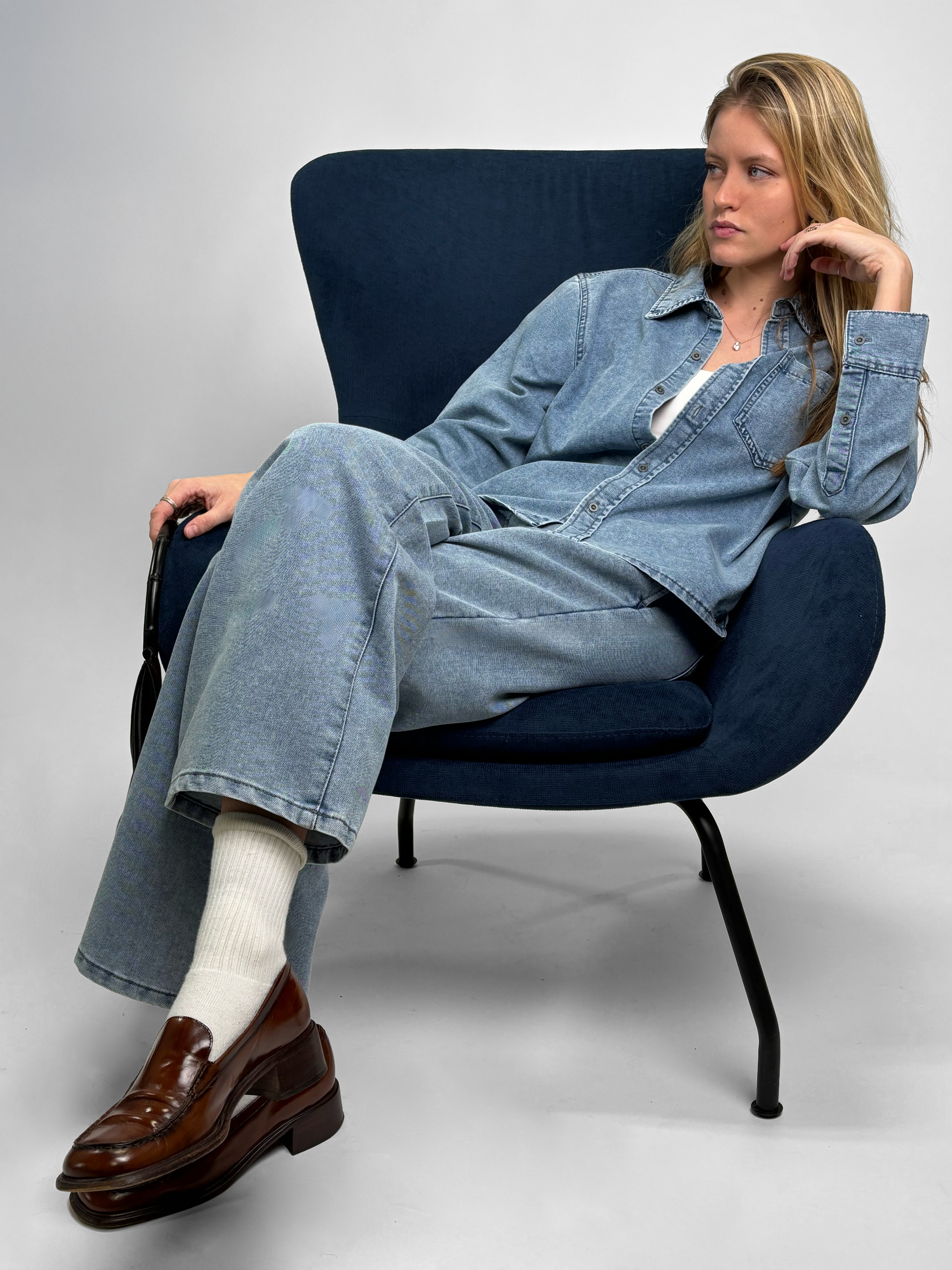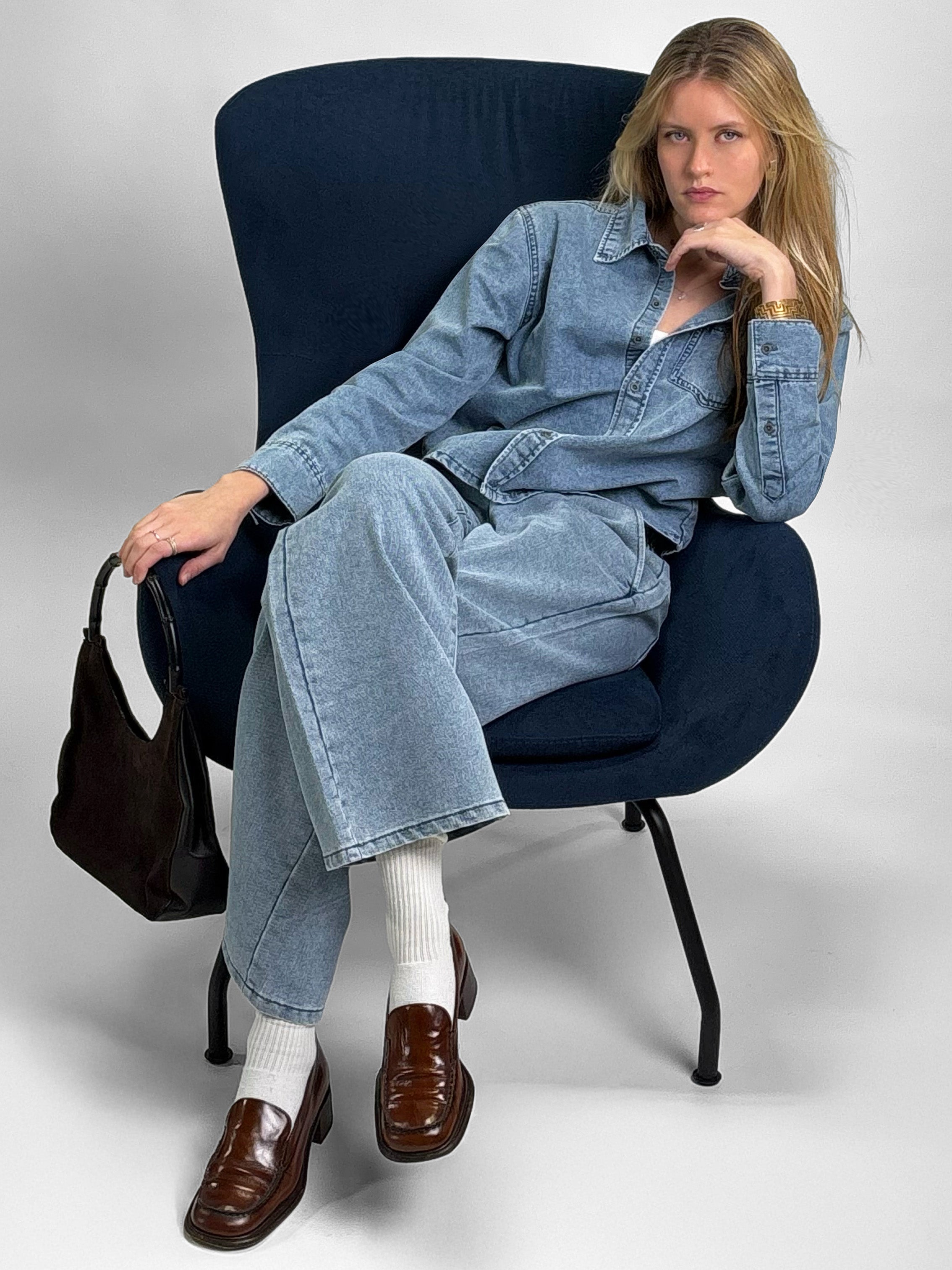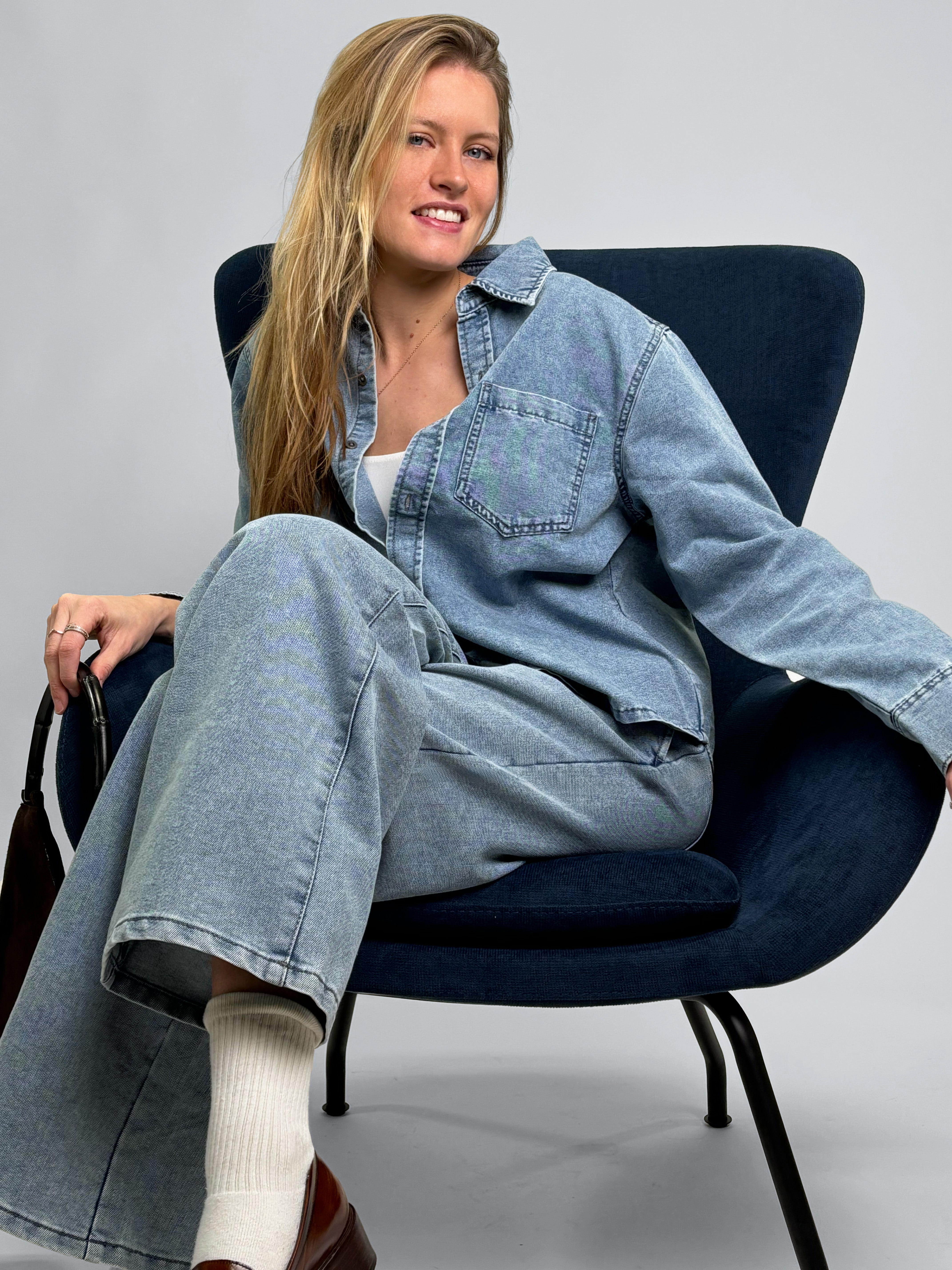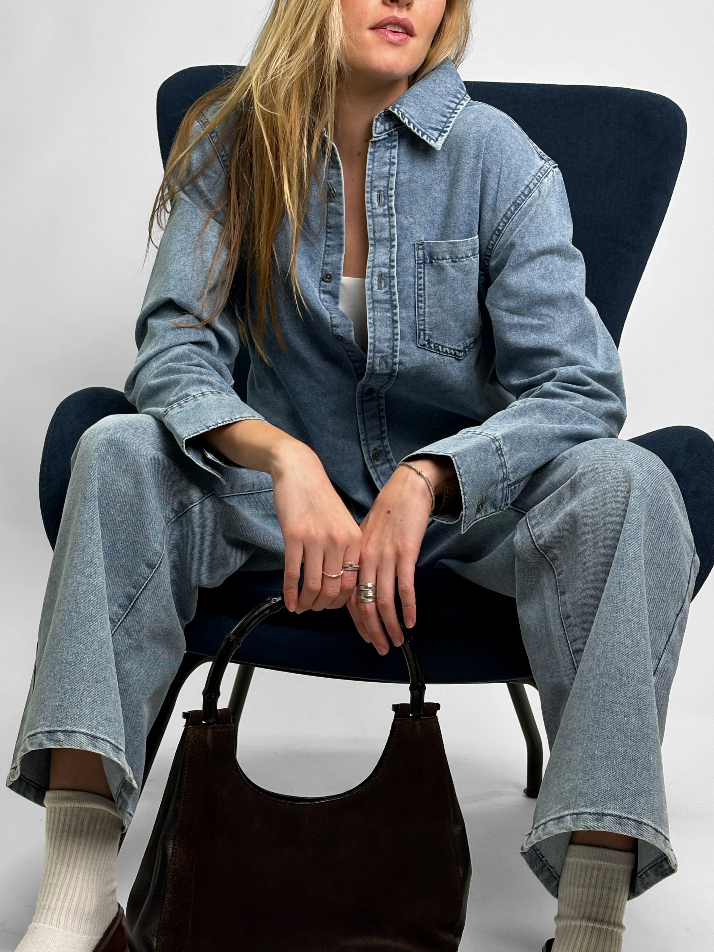 -%The Debbie Cropped Denim Button-Up Shirt is a modern essential designed with a clean silhouette and elevated denim feel. Crafted from buttery-soft poly-cotton denim, this long-sleeve shirt delivers comfort, structure, and effortless style.